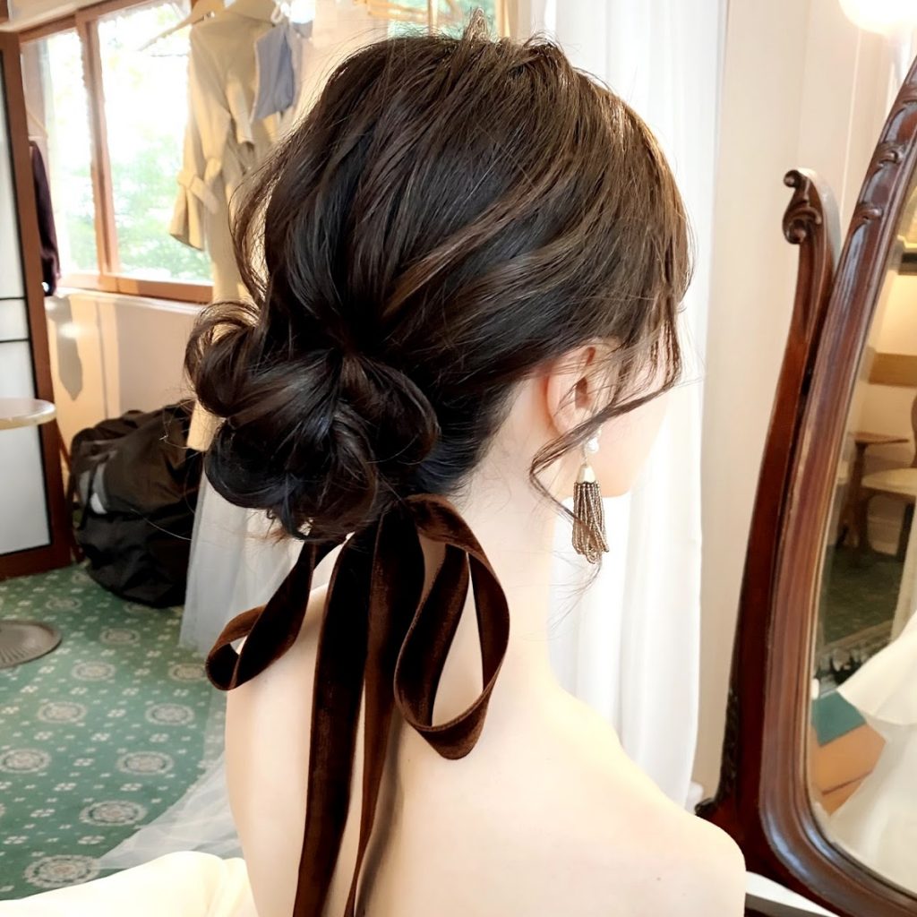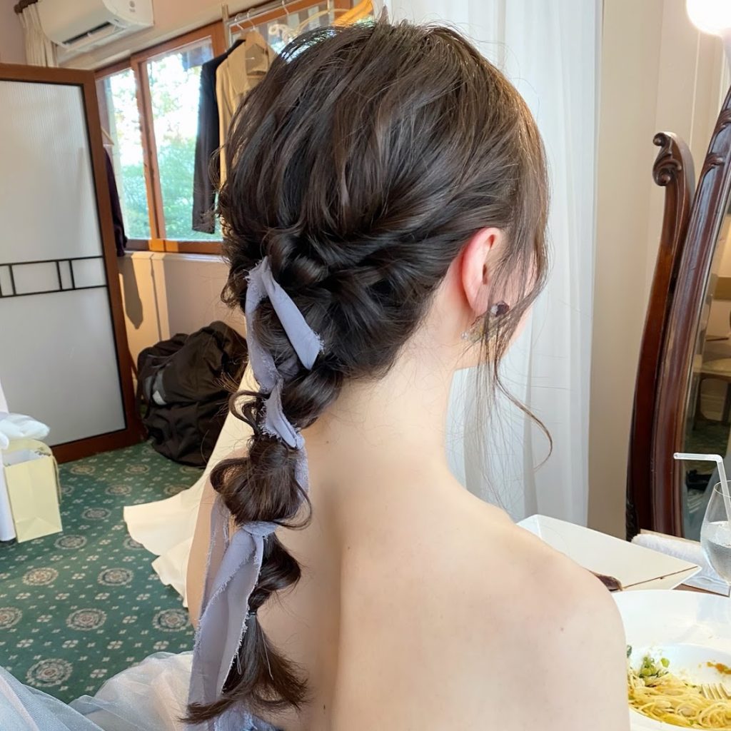 お色直しは編みおろしにリボンアレンジ。