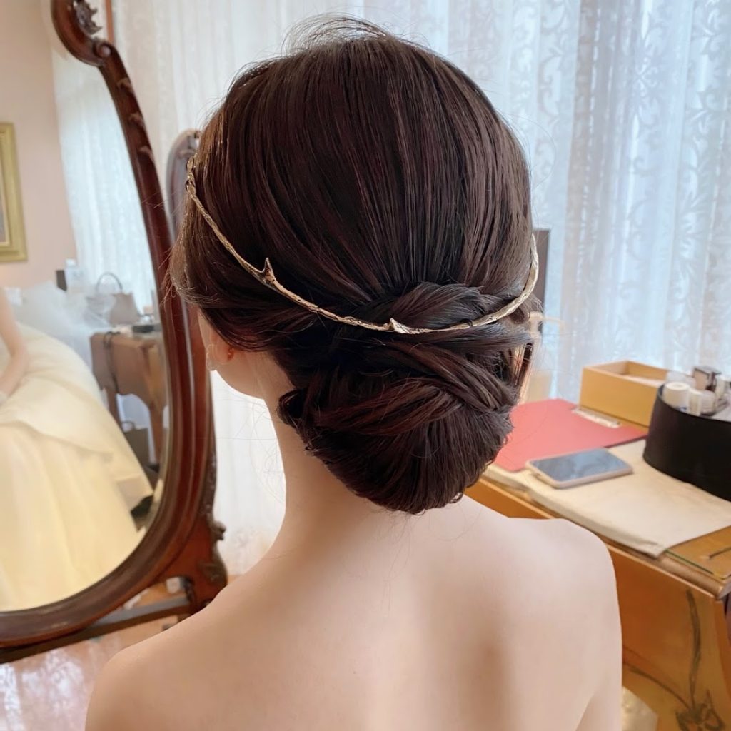 挙式スタイルはスタイリッシュなシニヨンに。