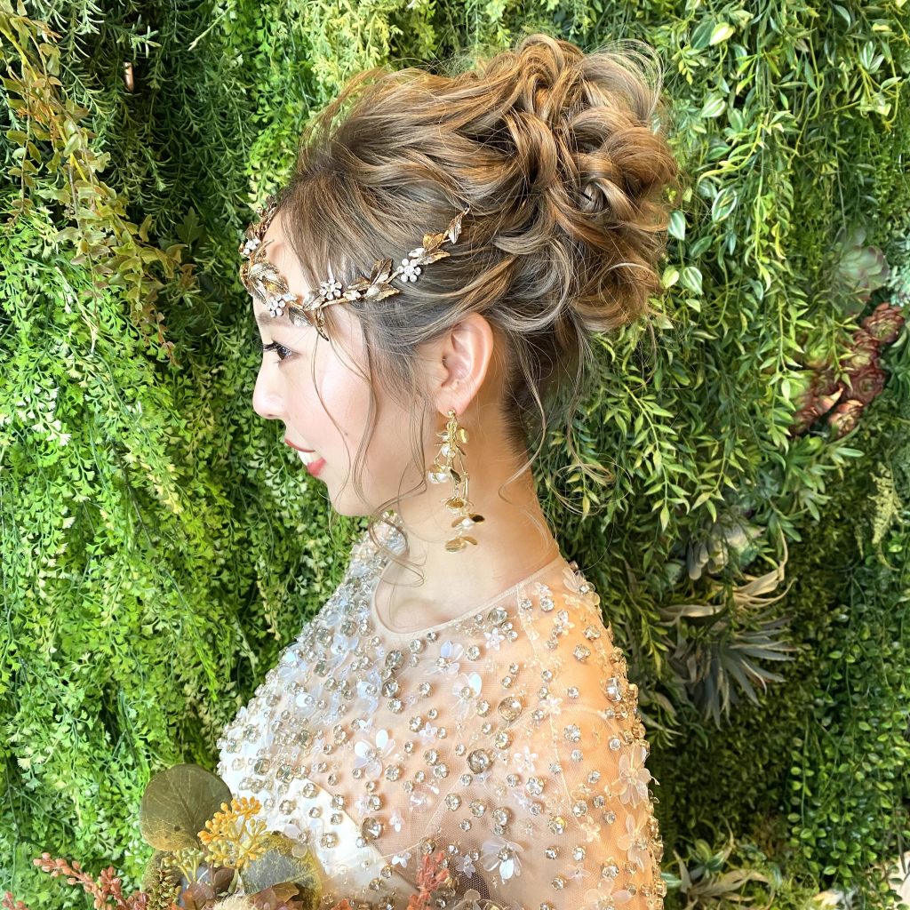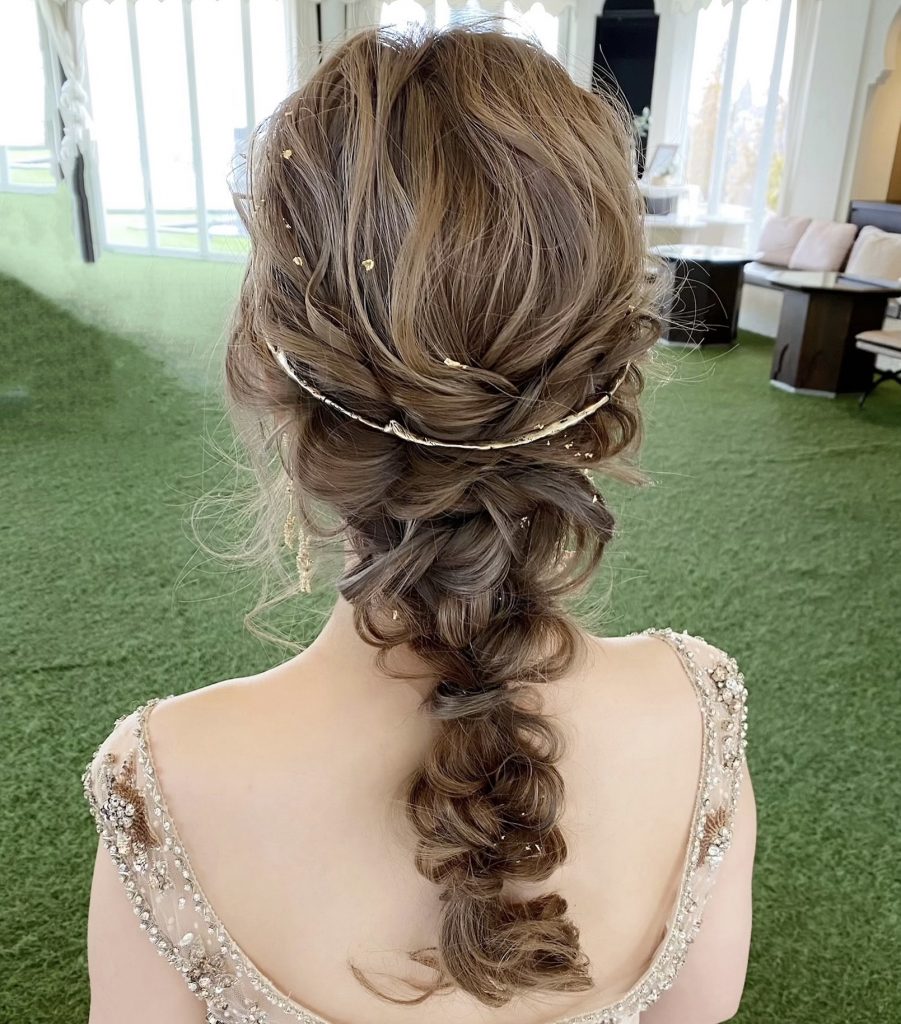 ヘアスタイルは編みおろしで金箔とプリュイのホーンクラウンを付けました♡